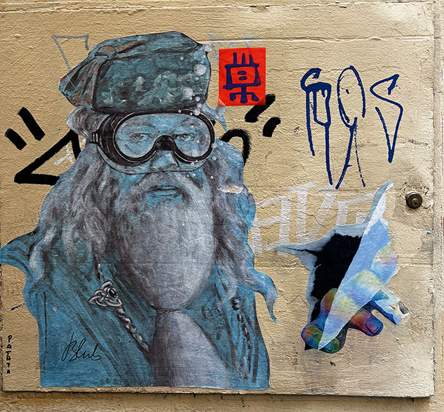 Then I saw it. A cut-out paper print of a drawing of Dumbledore (of Harry Potter fame), but wearing a snorkelling mask, wheat-pasted over the top of some graffiti, signed Blub.